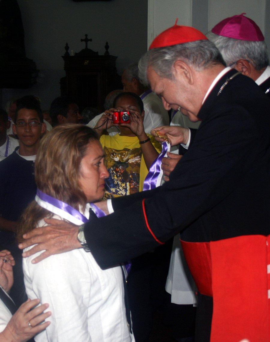 Caracas, 13 de abril de 2011. El domingo 10 de abril, después de concluida la Peregrinación con la Imagen del Nazareno de San Pablo que recorrió durante cinco fines de semana a sectores de Caracas, el Cardenal Jorge Urosa Savino entregó medallas de reconocimiento a distintos colaboradores de esta actividad, durante un sencillo acto que se cumplió en la Basílica de Santa Teresa. De esta manera, integrantes de la Cofradía de Cargadores del Nazareno, brigadistas del Ministerio de Orden y Disciplina de la Basílica; y la Coordinación de Seguridad de la Basílica Santa Teresa, recibieron junto a representantes de la Policía Municipal de El Hatillo y otros colaboradores vinculados a la Iglesia, una medalla dorada con una cinta de bandas morada y blanca que el propio Arzobispo de Caracas colgó en el pecho de cada homenajeado.
